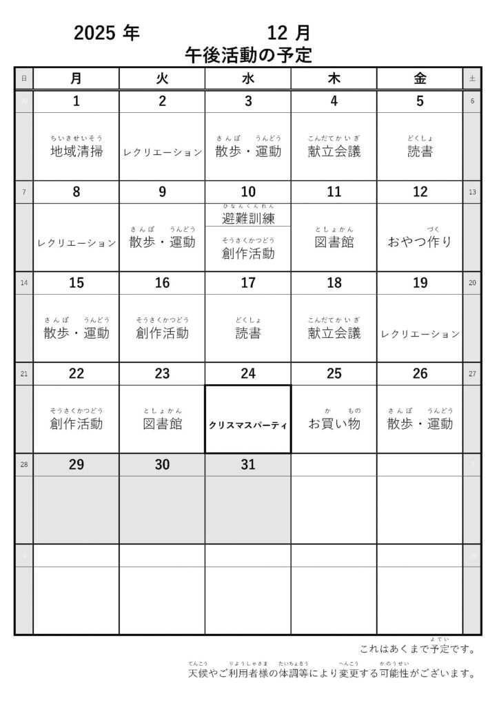 2025年12月活動予定表(生活介護)アップしました