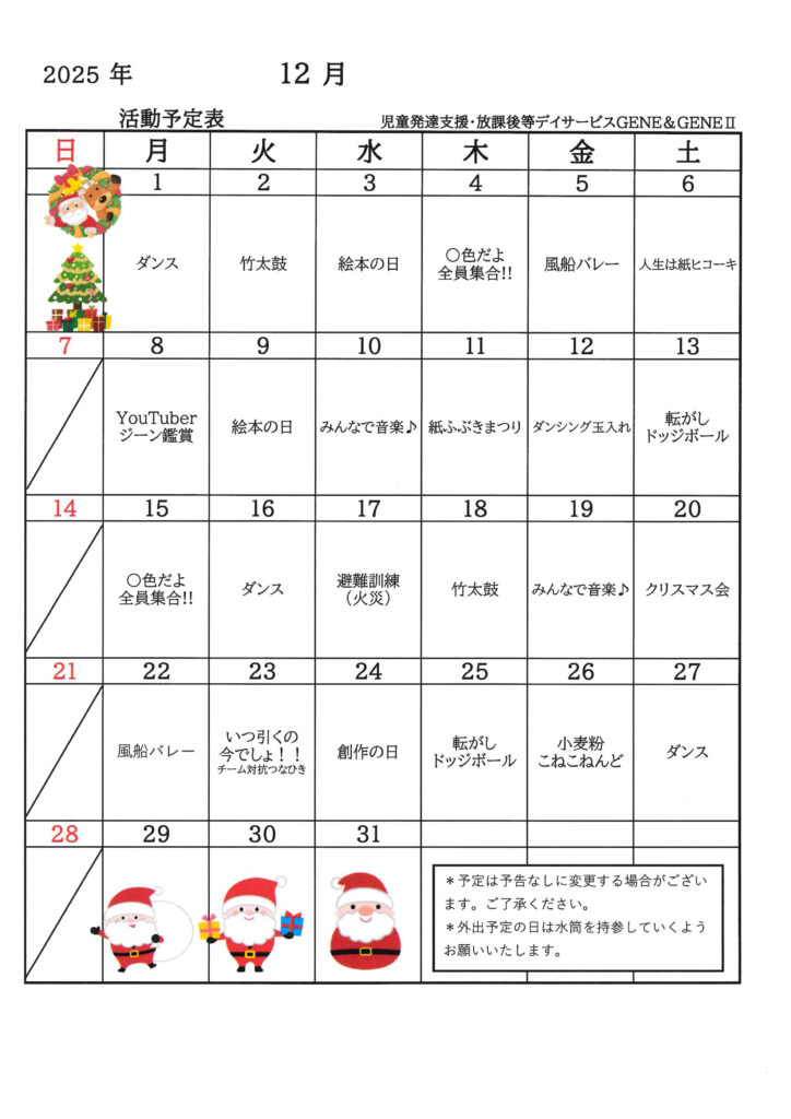 2025年12月活動予定表(放デイ)アップしました